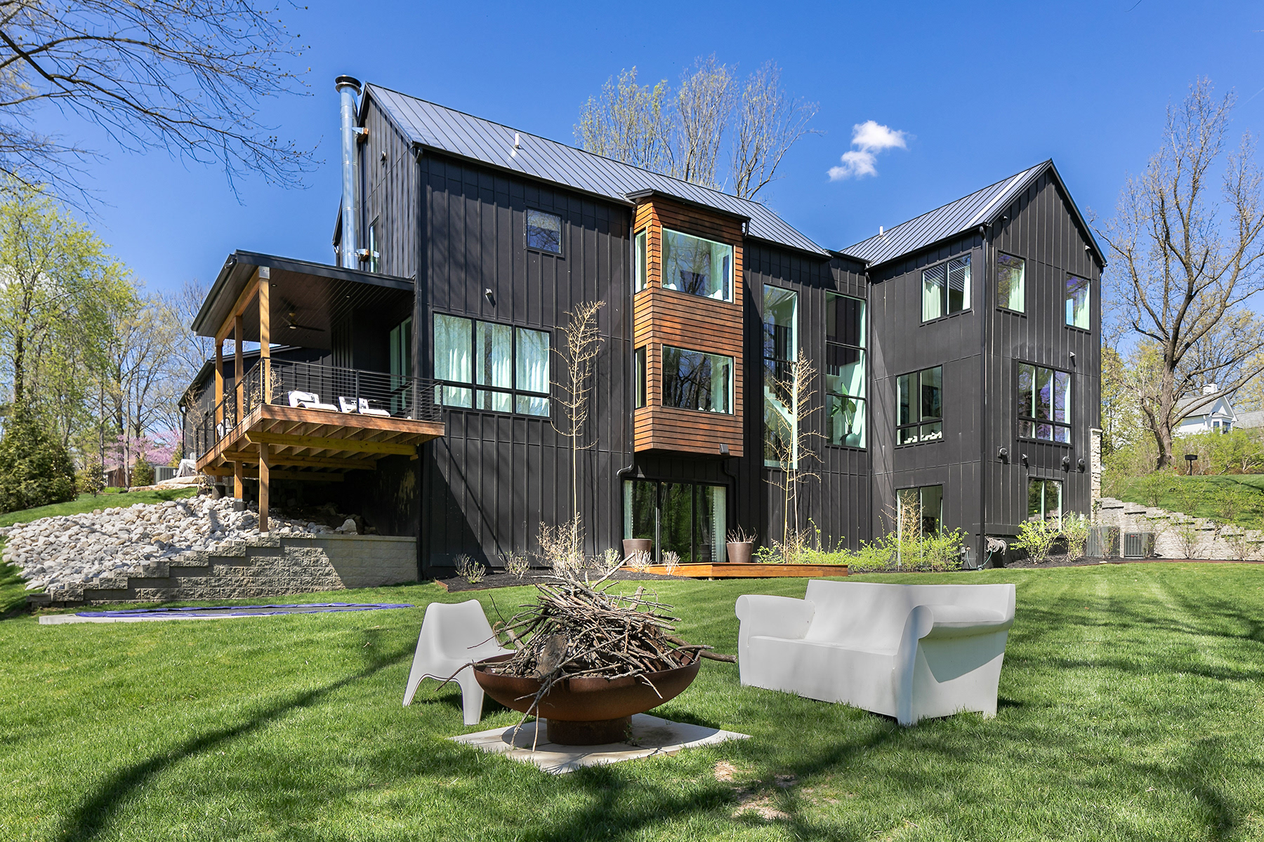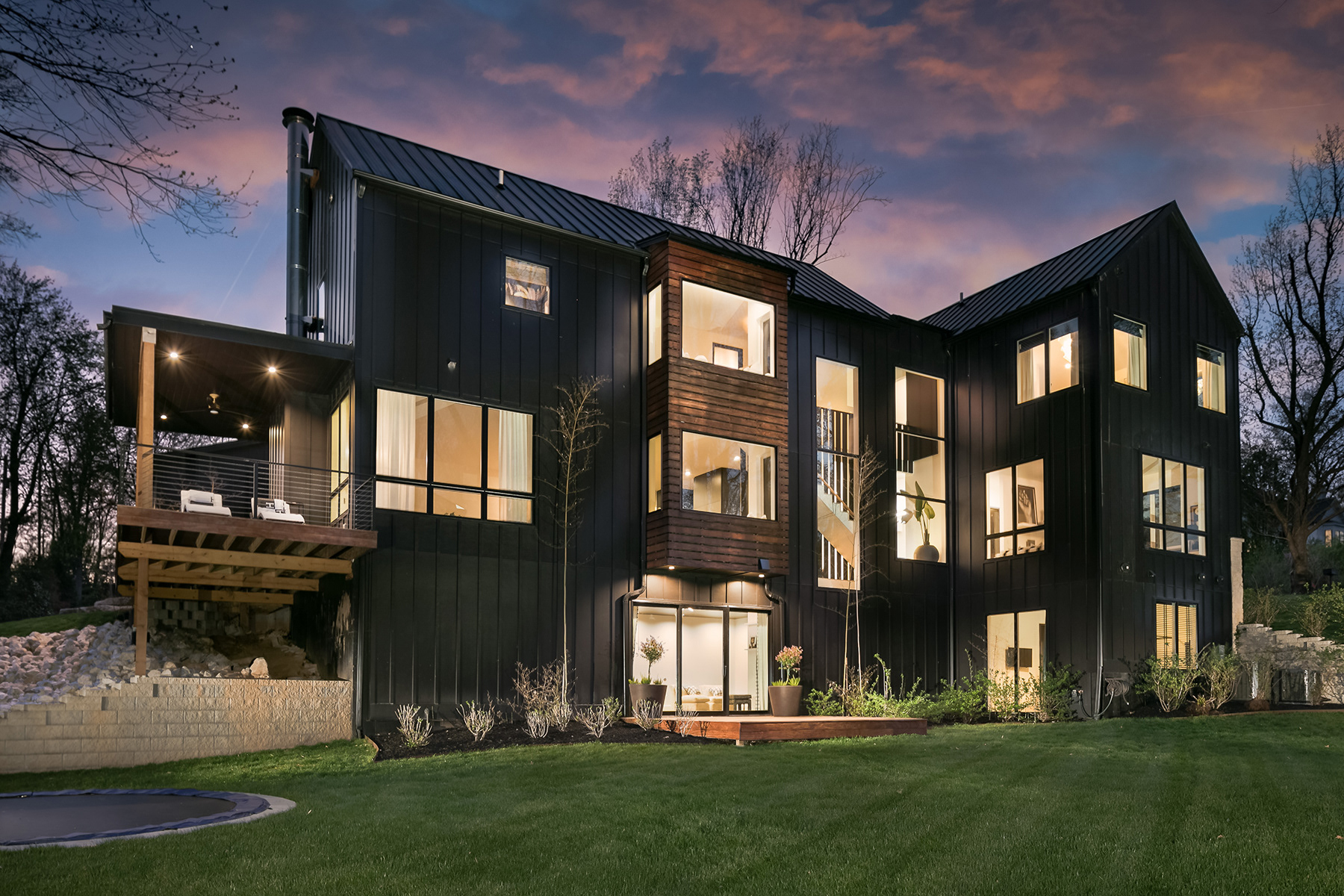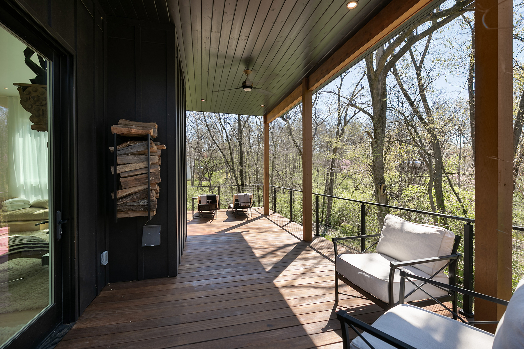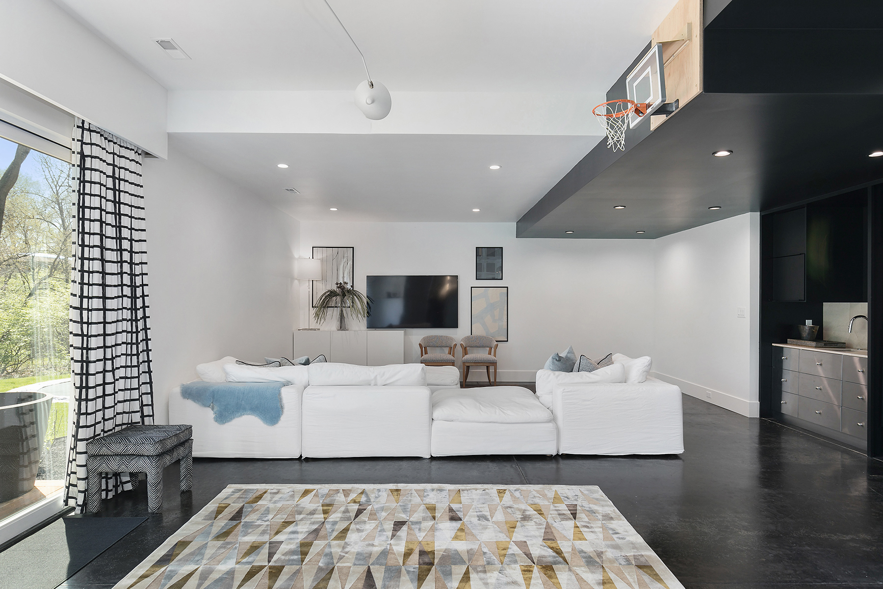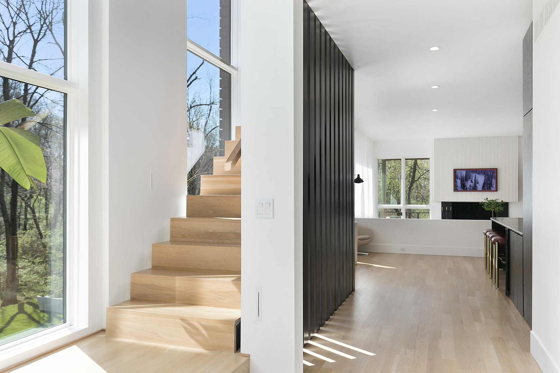 Located in relatively dense suburban neighborhood in St. Louis, this new-build home takes advantage of its sloped, wooded site by organizing the main living spaces to the rear — maximizing its connection to nature, while minimizing its proximity to neighbors. The semi-open plan allows for spaces to flow, while maintaining opportunities for separation and solace when needed. Along with the usual amenities, he main floor master suite has its own private outdoor terrace. The lower-level is an imaginative recreation space, complete with an impromptu nerf basketball court! Access to the rear yard complete the house's connection to nature.