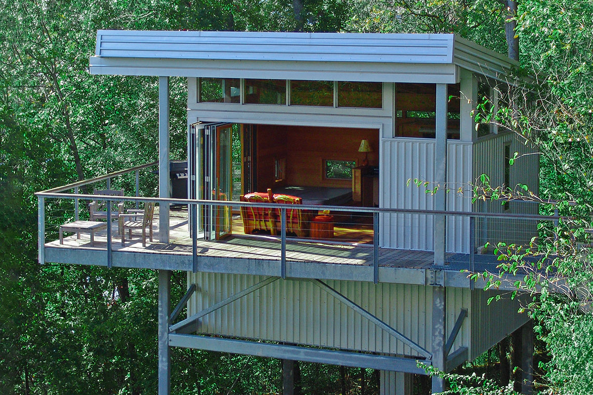 Located on a bluff overlooking the Missouri River, this personal spa in Calhoun County combines a modern aesthetic with an intimate experience of nature. With an eye for detail, the off-the-shelf materials speak to the rural setting and practicality of life in the country.